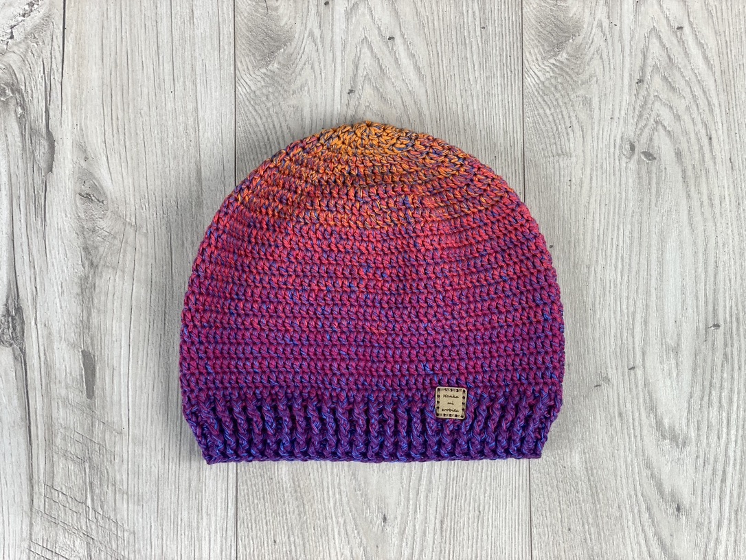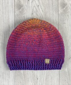 Czapka w kolorze „ombre” – przechodzące od fioletowego do pomarańczowego z jedno nitka niebieskiego